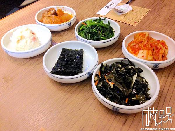 每個套餐都有附上五種小菜、海苔與紫米石鍋飯,